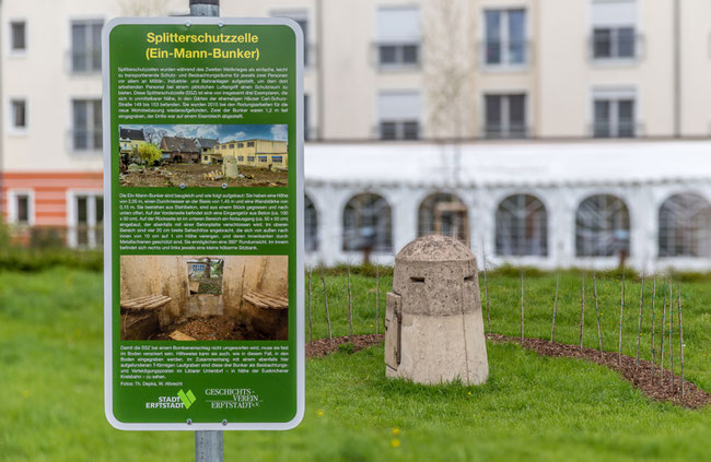 Zwei der drei Splitterschutzzellen wurden zu anderen Aufstellungsorten abtransportiert (Lauerbusch Bliesheim, Eisenbahnmuseum Rommerskirchen) Der verbliebene fand nach mehreren Standortwechseln 2023 hier seinen endgültigen Aufstellungsort. Zur Erläuterung erstellte der Geschichtsverein Erftstadt eine Informationstafel.