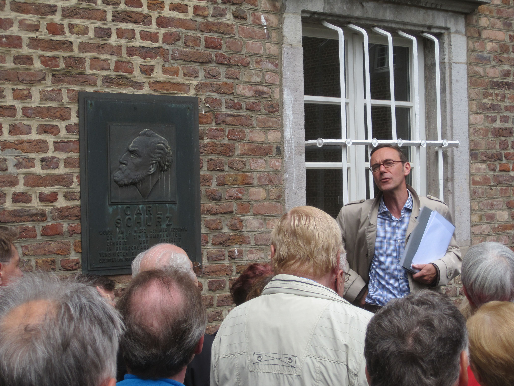 Die Exkursion endete an der Buchhandlung Pier, dem Standort des Wohnhauses der Familie Schurz, in dem Christinan Schurz zunächst eine Schule und später eine Eisenwarenhandlung betrieb. Nach dem Abriss des Hauses war hier der erste Standort des Carl-Schurz-Denkmals.