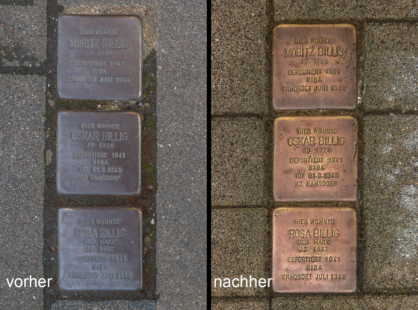 Zum „Tag des Gedenkens an die Opfer des Nationalsozialismus“ (27. Januar) beschlossen Willi Albrecht und Thomas Depka vom Vorstand des Geschichtsvereins Erftstadt e.V., die an der Liblarer Carl-Schurz-Straße verlegten „Stolpersteine“ zu polieren, um sie so wieder besser sichtbar zu machen. Die insgesamt 10 Steine aus Messing wurden am 29.August 2009 vom Kölner Künstler Gunter Demnig verlegt. Sie erinnern an die jüdischen Bürgerinnen und Bürger Liblars, die einst in den Häusern an der Carl-Schurz-Straße lebten und später von den Nazis deportiert und getötet wurden. Mit neuem Glanz sollen sie, oftmals im Alltag übersehen, als Mahnung und historische Erinnerung dienen.